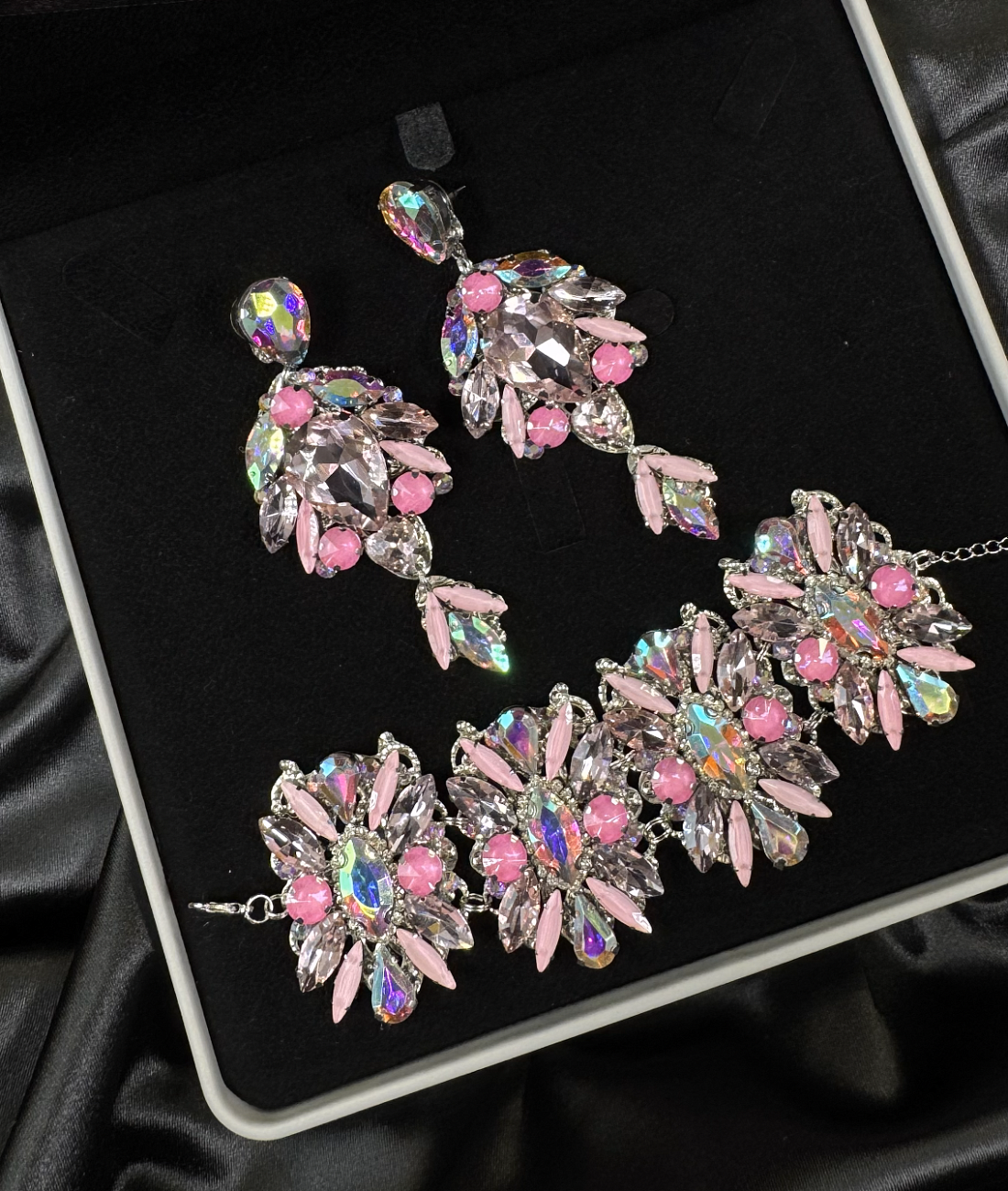 We sew the base using proven stretch fabrics — Italian velvet and approve the fit with you. Then the decoration begins: we use only reliable crystal-setting methods, hand-sewing large stones.