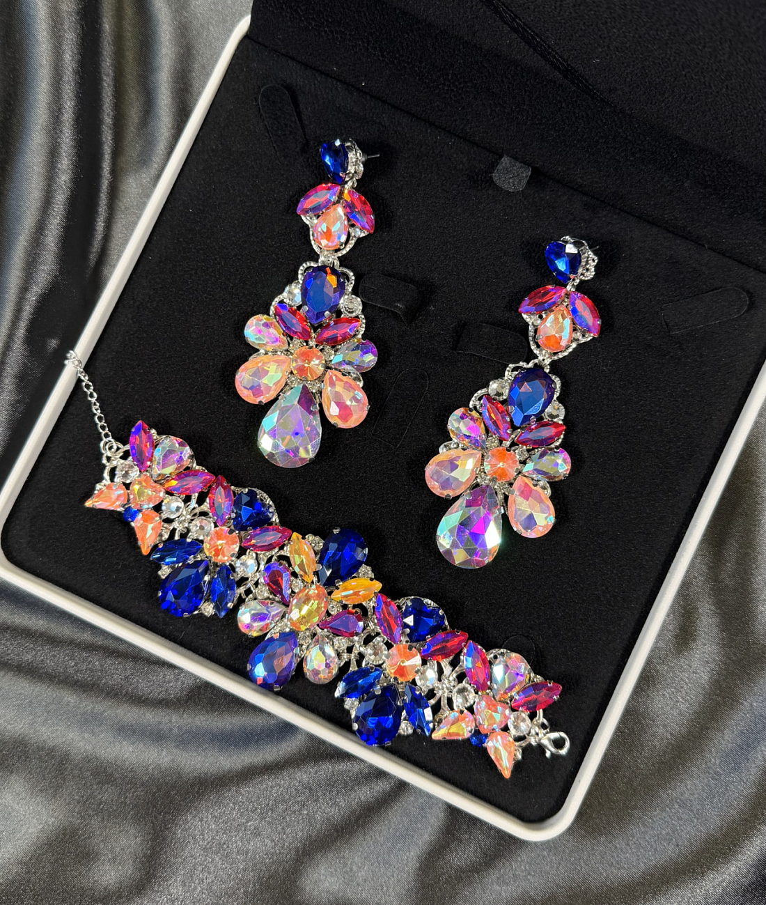 We sew the base using proven stretch fabrics — Italian velvet and approve the fit with you. Then the decoration begins: we use only reliable crystal-setting methods, hand-sewing large stones.