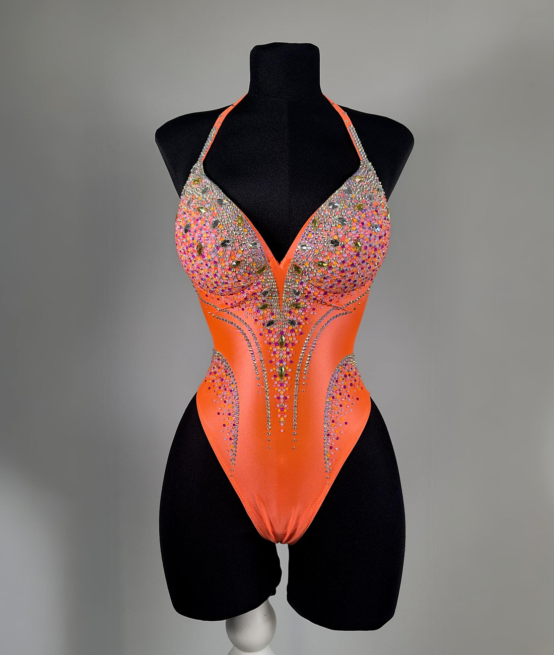 We sew the base using proven stretch fabrics — Italian velvet and approve the fit with you. Then the decoration begins: we use only reliable crystal-setting methods, hand-sewing large stones.