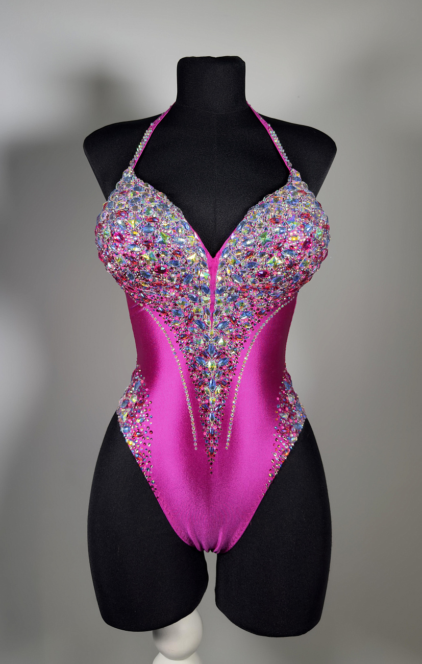 We sew the base using proven stretch fabrics — Italian velvet and approve the fit with you. Then the decoration begins: we use only reliable crystal-setting methods, hand-sewing large stones.