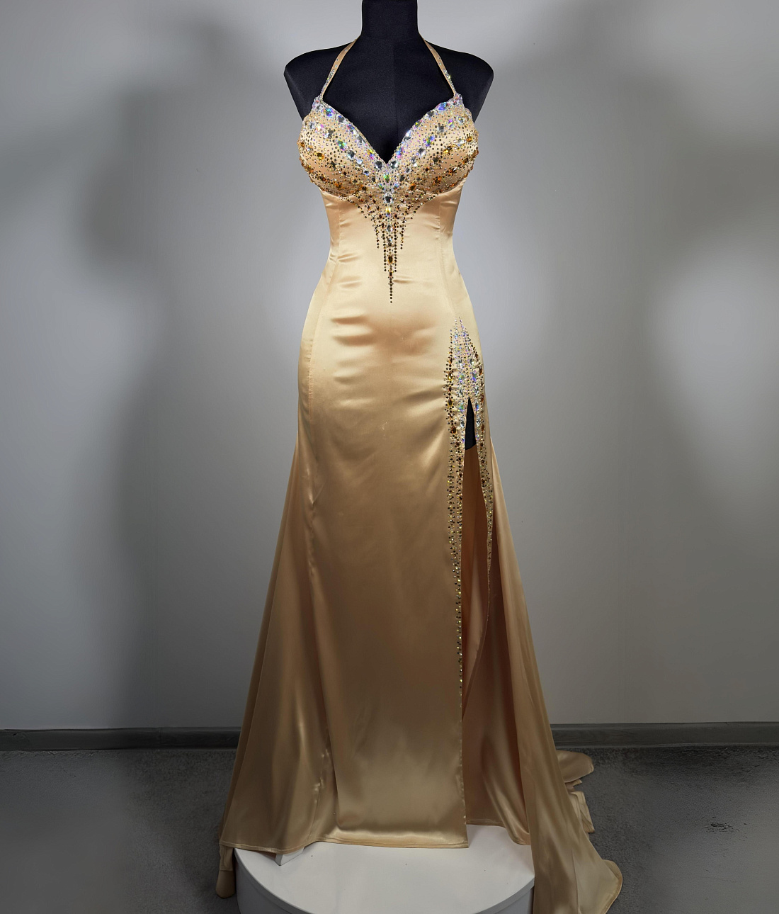 We sew the base using proven stretch fabrics — Italian velvet and approve the fit with you. Then the decoration begins: we use only reliable crystal-setting methods, hand-sewing large stones.