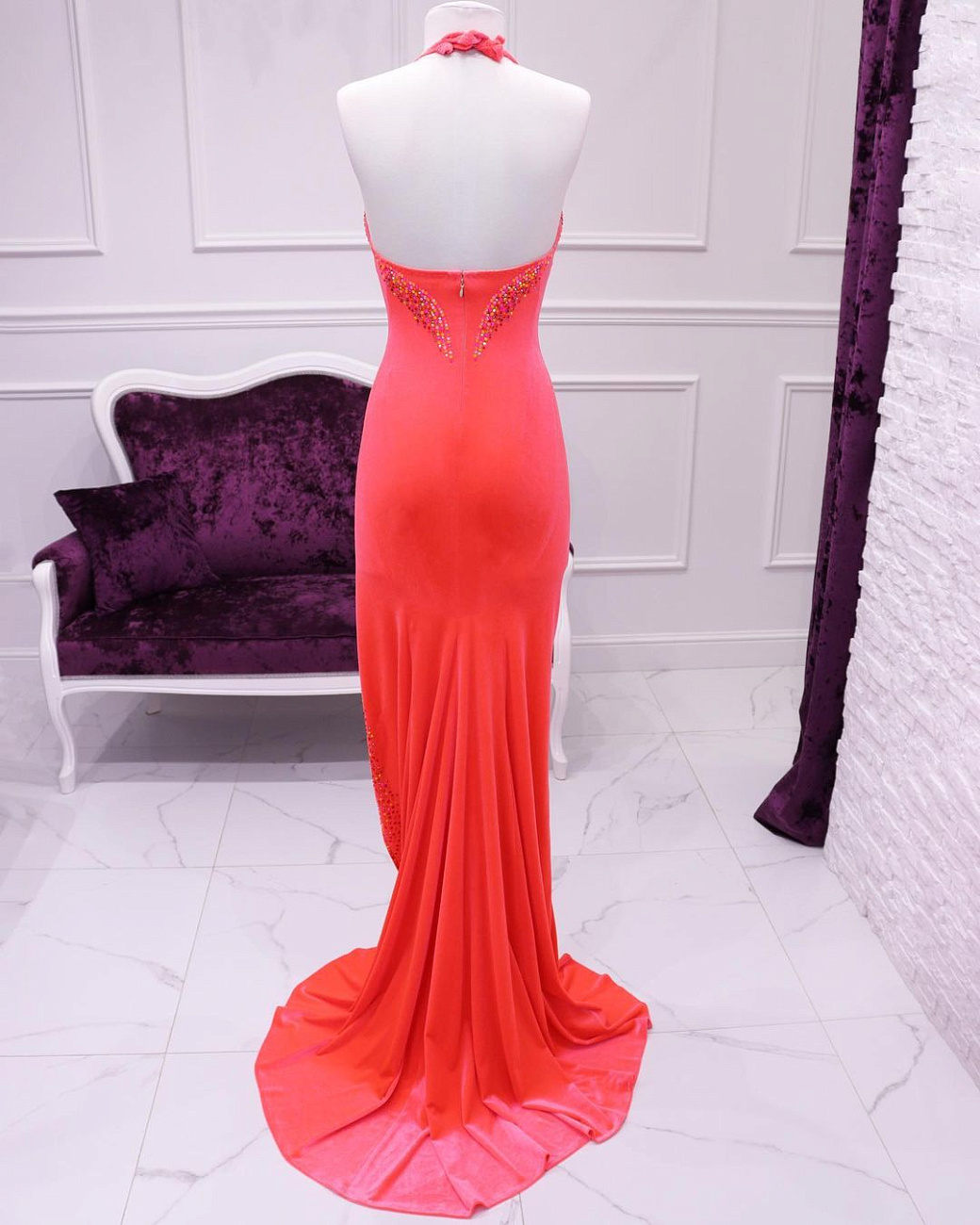 We sew the base using proven stretch fabrics — Italian velvet and approve the fit with you. Then the decoration begins: we use only reliable crystal-setting methods, hand-sewing large stones.